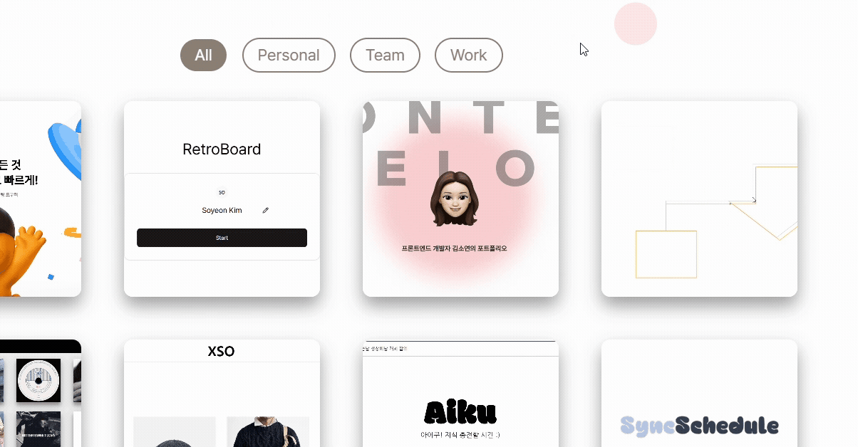 -offsetTop만큼useAnimate로 리스트를 이동시키고 나머지 항목은 보이지 않게 하여, 자연스럽게 전환되도록 구현마우스 오버 시 전체 섹션 목록이 펼쳐져 이동하고자 하는 섹션을 선택 가능하도록 구현