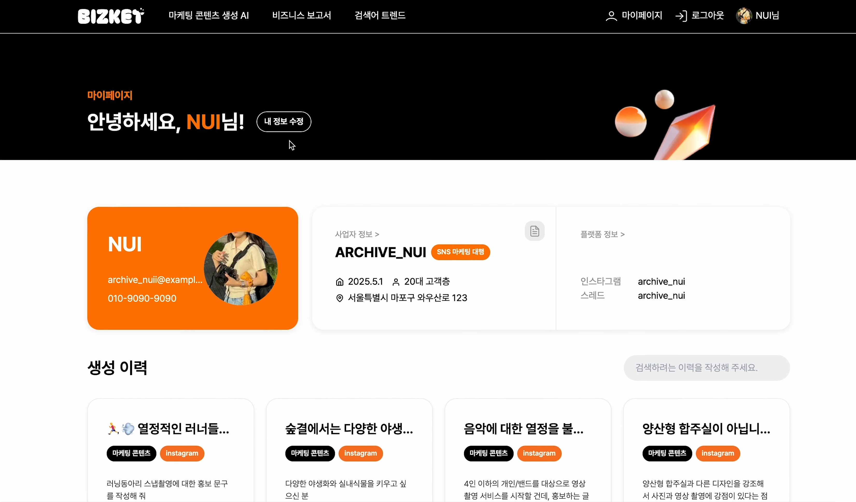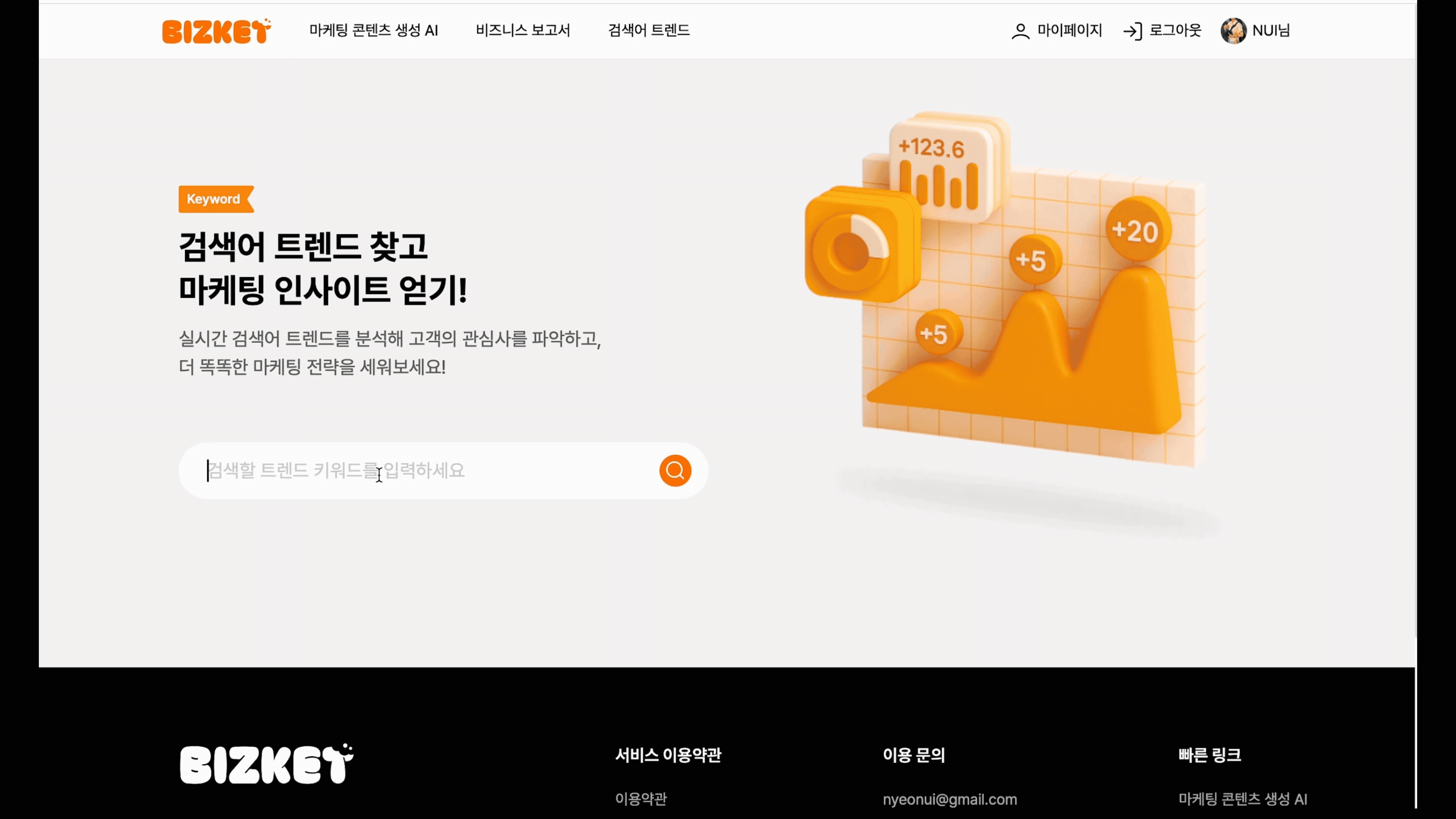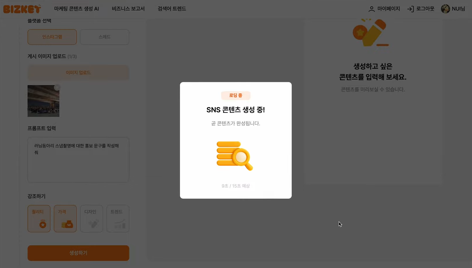 AI 마케팅 문구 생성, SNS 비즈니스 보고서 분석, 검색어 트렌드 파악 등의 기능을 통해 SNS 마케팅 콘텐츠를 효율적으로 제작할 수 있도록 돕는 서비스입니다. (발표자료)